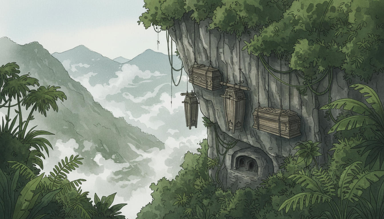 フィリピンのルソン島北部、サガダという山岳地帯に、信じられない光景があります。断崖絶壁の岩肌に、何百もの棺が吊るされているのです。